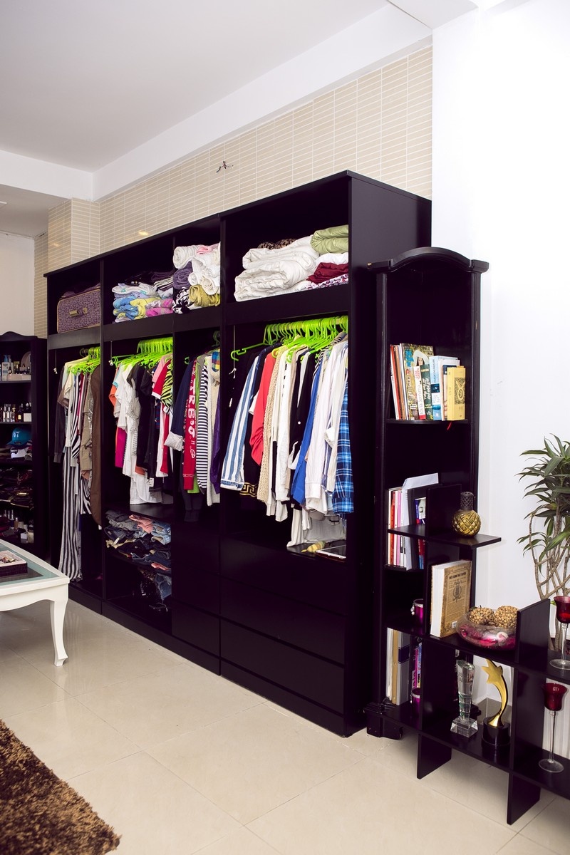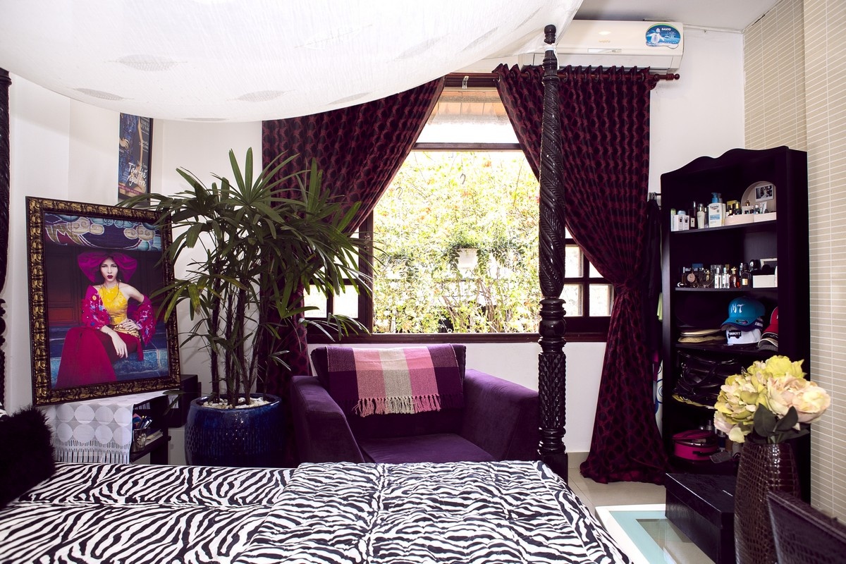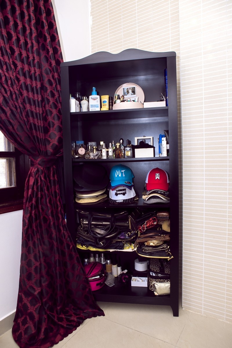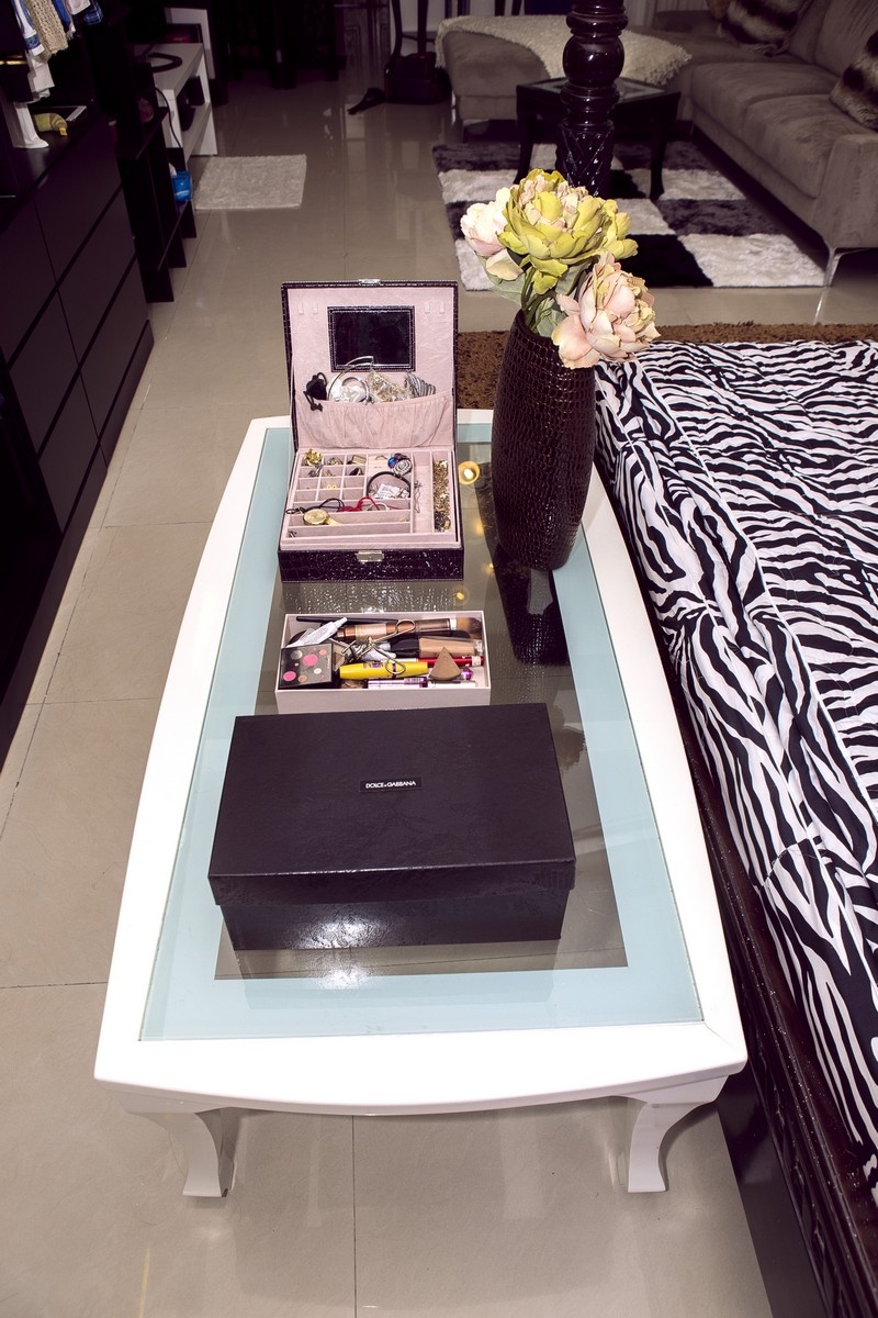 Phía chân gường là bàn gỗ đặt phụ kiện thời trang và bộ trang điểm, vị trí khá tiện lợi để cô sử dụng hàng ngày.