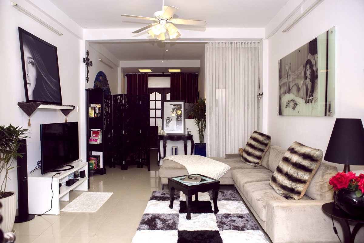 Phòng khách được sửa lại với gam màu đen - trắng. Minh Triệu cho biết, cô thuê ngôi nhà đã được 2 năm. Trước đây, nữ người mẫu thích ở chung cư, nhưng lại quá bất tiện về giờ giấc. Cô quyết định dọn qua căn hộ này để tiện việc đi lại, chủ động hơn về thời gian.