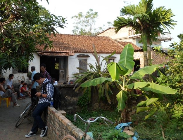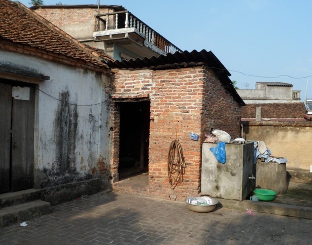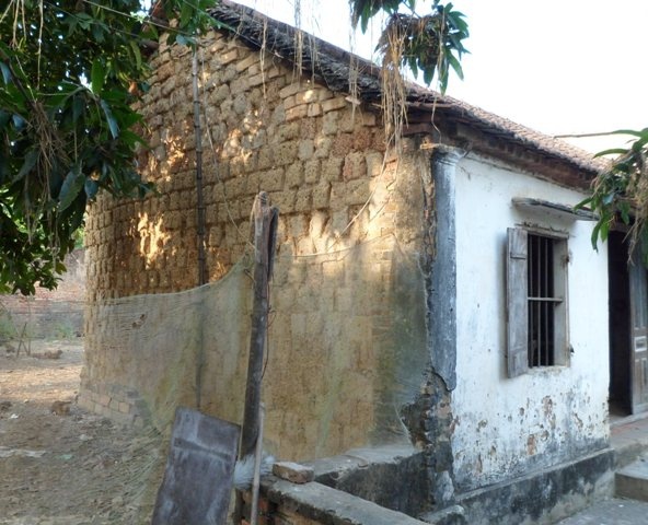 | Đầu đốc nhà không được trát vữa lộ hàng gạch bằng đất, cửa sổ thiếu cánh. |