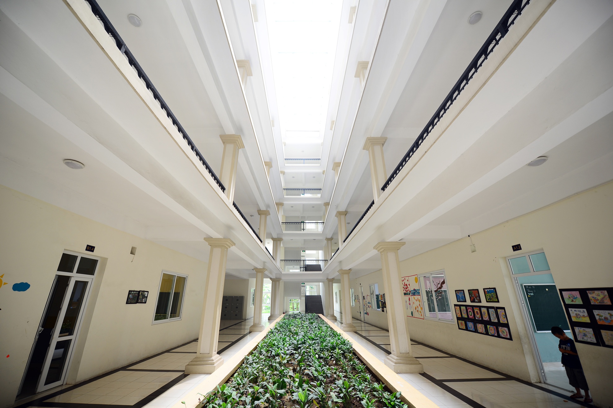 | Giữa mỗi tòa nhà đều có giếng trời để đón ánh sáng tự nhiên vào từng lớp học. Ánh sáng tự nhiên dành cho lớp học được ưu tiên hàng đầu còn được lấy thông qua hệ thống cửa sổ lớn nhằm giảm thiểu cận thị cho học sinh từ nhỏ, giúp các em có thể hòa mình với thiên nhiên, hạn chế căng thẳng để tiếp thu từng bài học một cách tích cực nhất. |