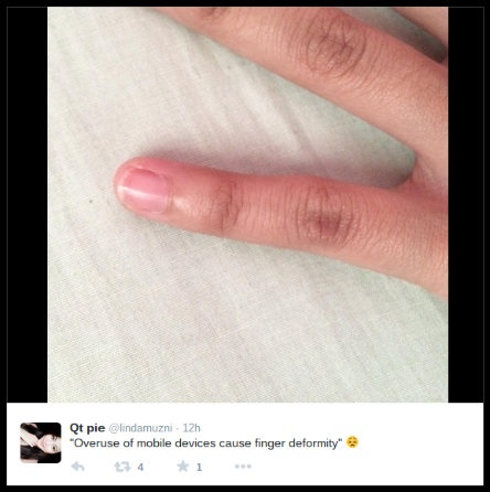 Theo Docomo, người nghiện smartphone thường để máy tì lên ngón út và lâu dần ngón tay này sẽ bị "lõm" và khó có thể quay về hình dạng bình thường. Trong đoạn tweet, Docomo không dẫn lại bằng chứng khoa học nào để chứng minh nội dung đó là có thật. Tuy nhiên, thông tin từ trang mạng xã hội của hãng viễn thông lớn nhất Nhật Bản vẫn có uy tín nhất định, khiến nhiều người tin theo.