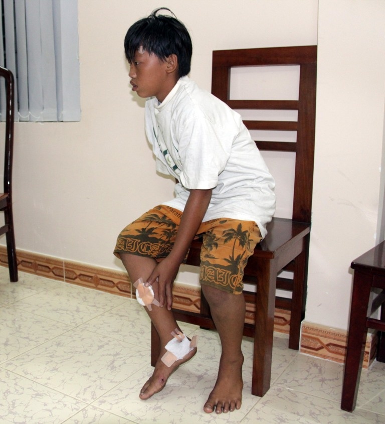 | Em Nguyễn Văn Bé bị thương ở đầu và chân. |