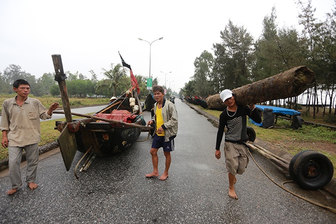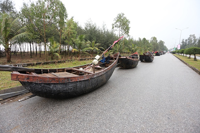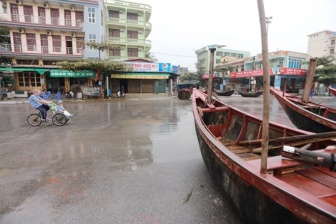 Thuyền cất gọn trên một con đường nhựa ven làng chài Quảng Cư. Ngư dân cho biết, mỗi khi bão về kết hợp triều cường bị ngập họ lại mặc quần đùi, áo mưa ra "giữ con".