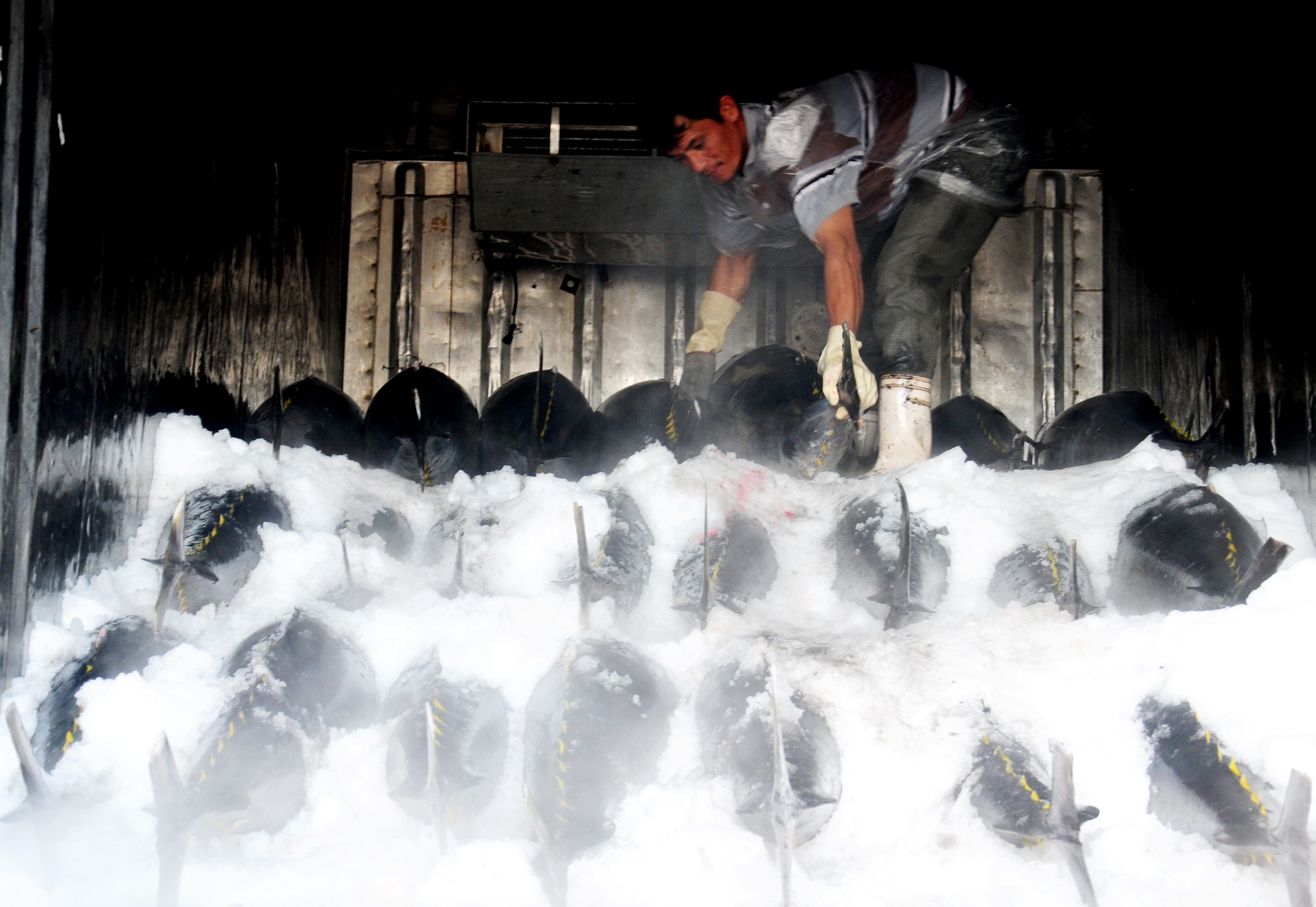 | Cá được xếp ngăn nắp trên xe tải lạnh chở đi tiêu thụ. |