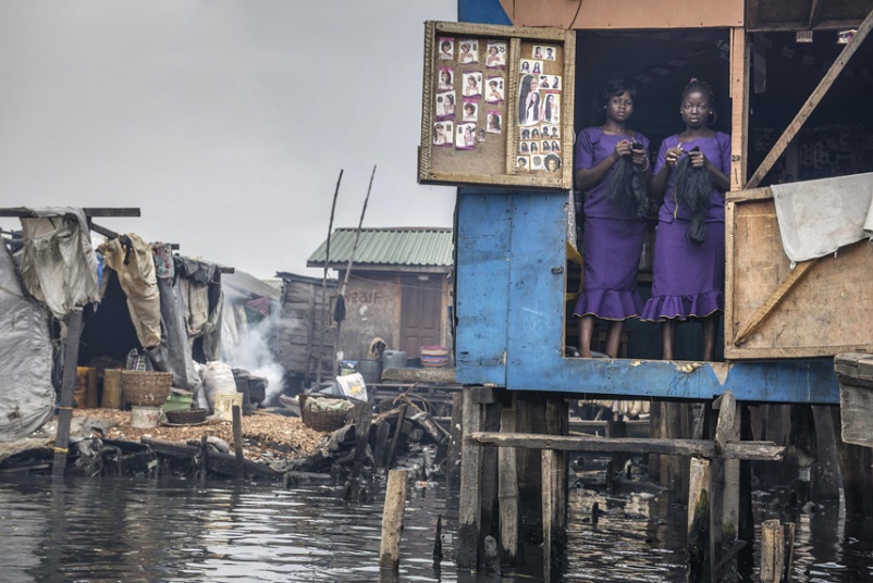 | Hai người phụ nữ ở thành phố Lagos, Nigeria, đang đứng ở lối vào của một tiệm làm tóc, chăm sóc sắc đẹp. Những căn nhà cơi nới tạm bợ chạy dọc khu đầm phá Lagos đã tạo nên khu ổ chuột Makoko đông đúc. Khu này nằm trong diện bị giải tỏa nhưng người dân ở đây đã dựng nhà trái phép khiến tình trạng ô nhiễm nguồn nước ngày càng trở nên nghiêm trọng. Ảnh: Petrut Calinescu. |