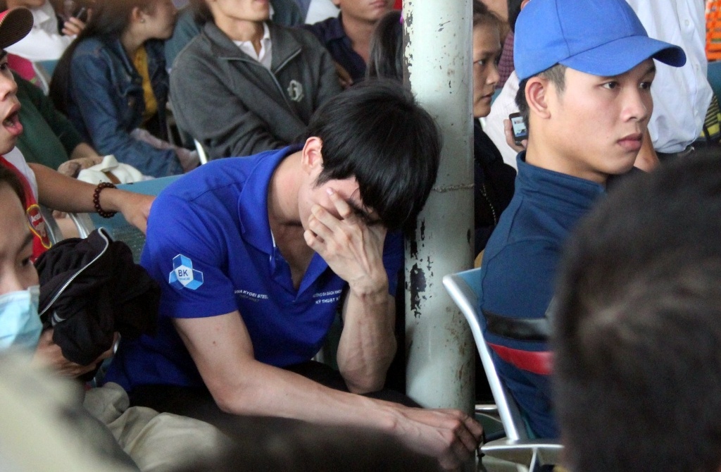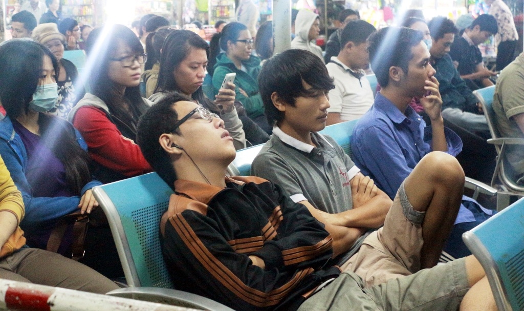 | Nhiều người đến bến xe rất sớm tỏ ra mệt mỏi và ngủ gục trên ghế. Ông Thậm Thanh Tùng (41 tuổi, quê Phú Yên, ngụ quận Gò Vấp) cho biết hôm qua ông đã đến nhưng bốc số thứ tự quá lớn nên không mua được. Sáng nay, ông cùng con trai đến bến xe Miền Đông từ lúc 0h ngồi hàng ghế đầu để được mua vé trước. |