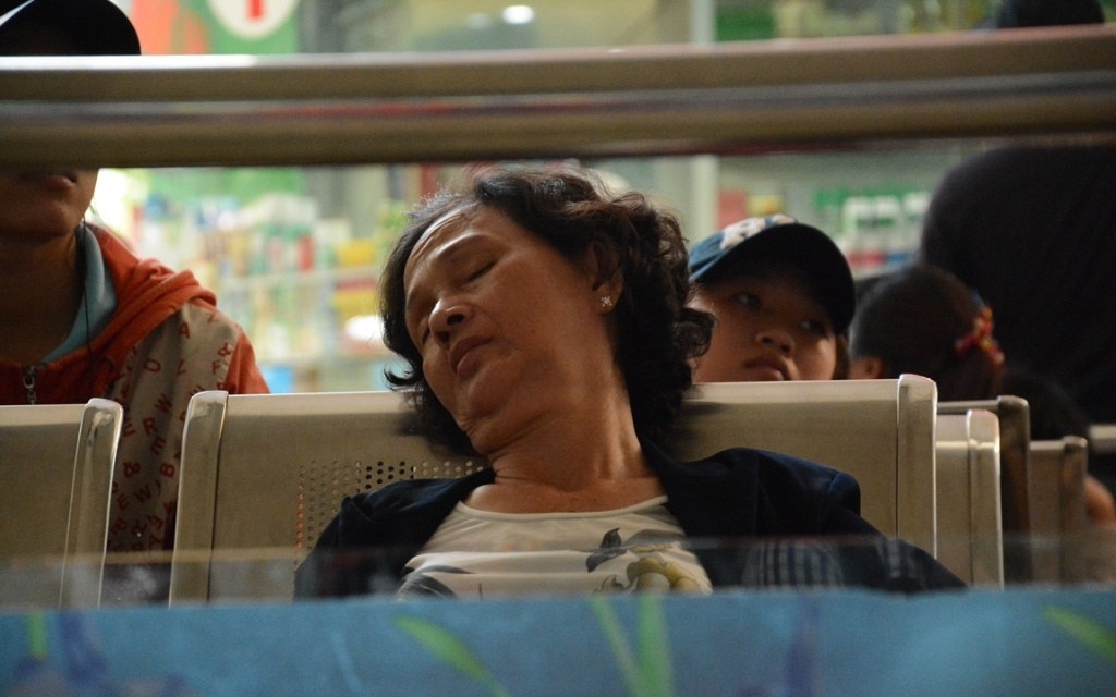 | Một phụ nữ mệt mỏi ngủ trên ghế chờ. |
