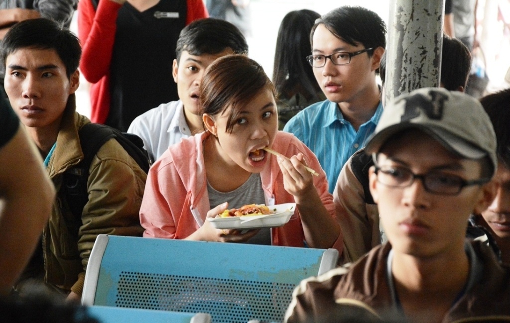 | Nhiều người tranh thủ ăn sáng trong lúc chờ đến lượt mình. Theo ghi nhận, vé xe Tết vào những ngày "đẹp" như 25 - 26 - 27 - 28 âm lịch đã hết trước đó hoặc có nhà xe chưa mở bán nên những người đến tìm vé vào những ngày này phải ra về. |