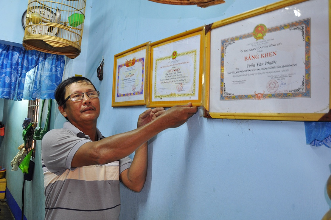| Ngư dân Trần Văn Phước nhận nhiều bằng khen. Ảnh: Ngọc An |