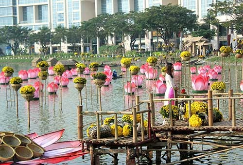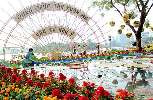 | Dưới hồ Bán Nguyệt (Phú Mỹ Hưng , quận 7) cũng rực rỡ sắc hoa. |