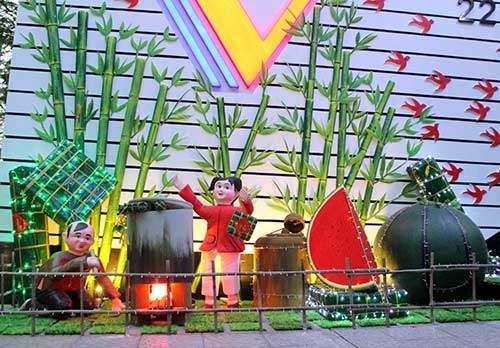 | Hình ảnh nồi bánh chưng xanh bên dưa hấu đỏ ngay giữa lòng thành phố. |