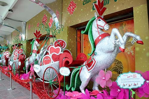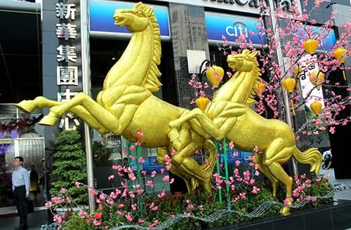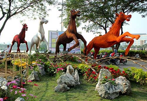 | Năm nay dù tình hình kinh tế vẫn khó khăn, nhiều doanh nghiệp, trung tâm thương mại tại TP.HCM vẫn trút hầu bao khủng cho việc trang trí Tết. Đón xuân Giáp Ngọ, đa phần các nơi đều chọn hình tượng con ngựa để trang trí. Những chú ngựa được làm từ nhiều chất liệu khác nhau, có kích thước như ngựa thật, với muôn hình vạn trạng. Hình ảnh ngựa thời gian trên đường hoa Nguyễn Huệ đã được hoàn thiện. |