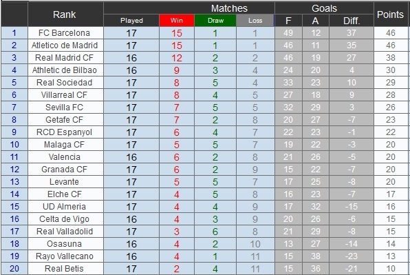 | Bảng xếp hạng vòng 17 La Liga 2013/14. |