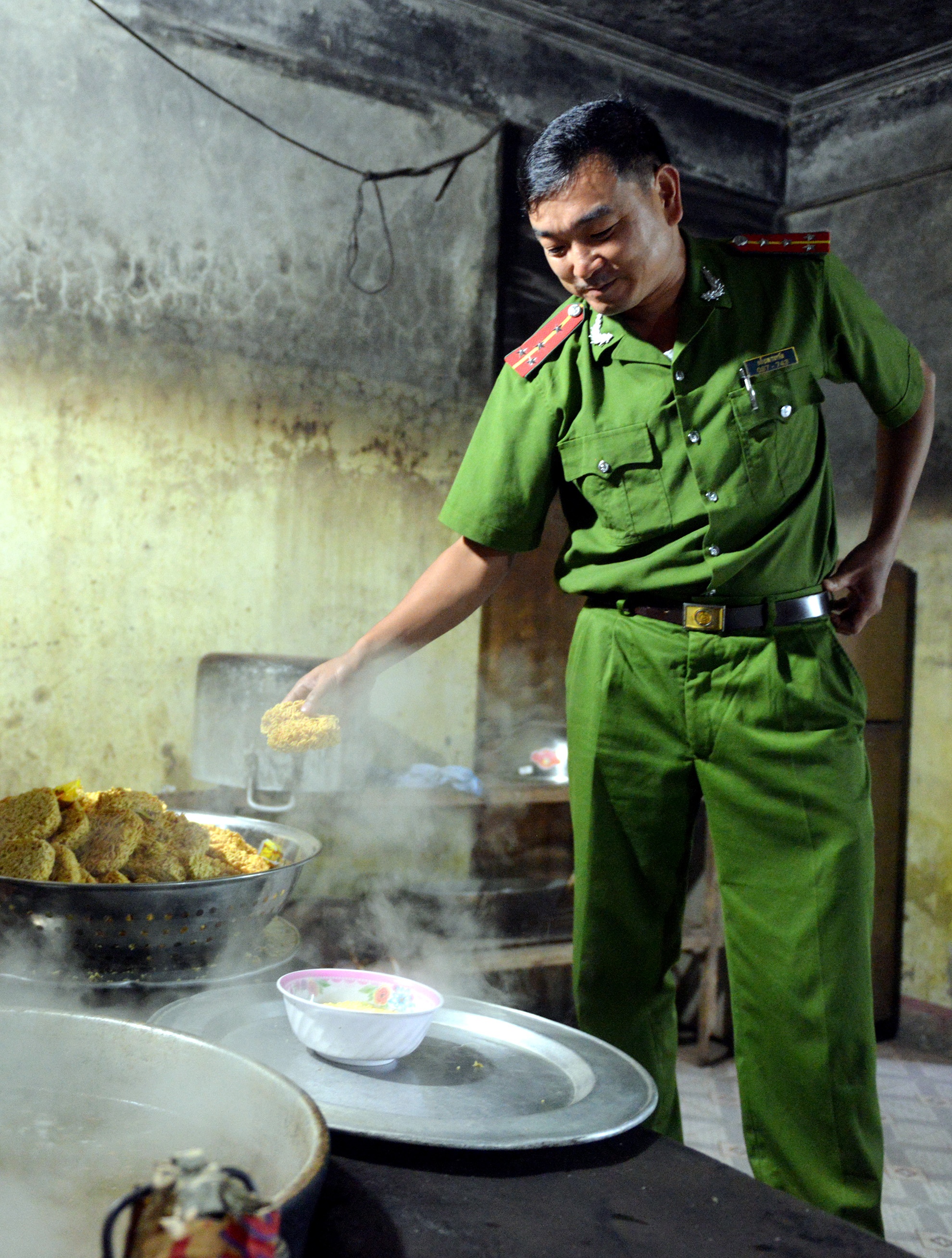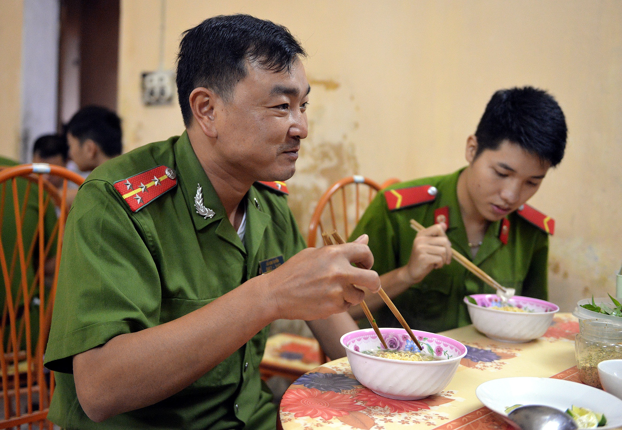 Khi đặt chân đến trụ sở, đại úy vào nhà bếp công vụ của trại giam (lúc 5h30), tự tay trần bát mì tôm dùng bữa sáng. Anh cho biết, ăn lót dạ để làm việc đến 12h trưa.