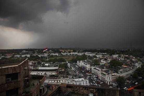 | Những đám mây đen dày đặc và nặng trĩu trên bầu trời ở trung tâm thủ đô New Delhi trong một ngày đầu tháng 7. |