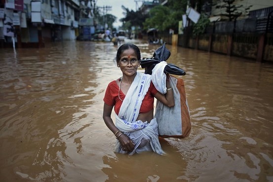 | Một người phụ nữ trung niên cố gắng di chuyển trong làn nước lũ tại thành phố Guwahati. |