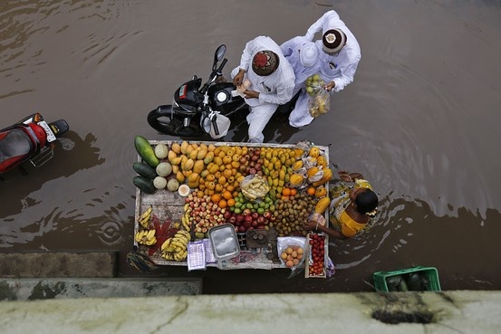 | 3 người đàn ông tại thành phố Ahmedabad dừng lại để mua trái cây ven đường hôm 18/7. Hoạt động mua và bán diễn ra trong nước lụt. |