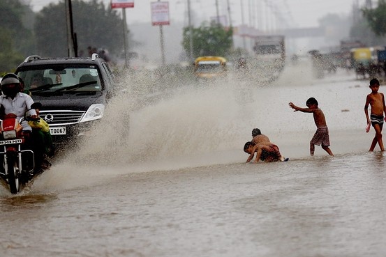 | Lũ trẻ con nô đùa trên một con đường ngập nước tại thành phố Faridabad. |