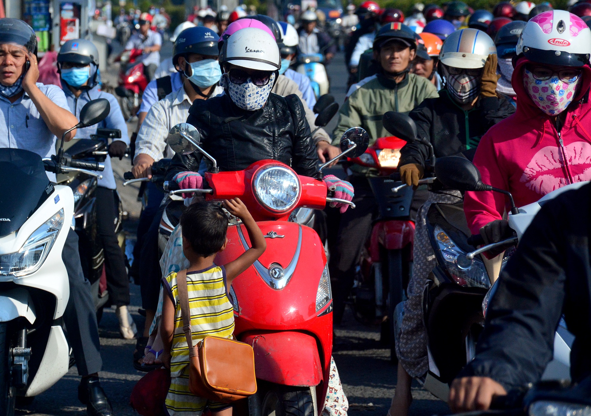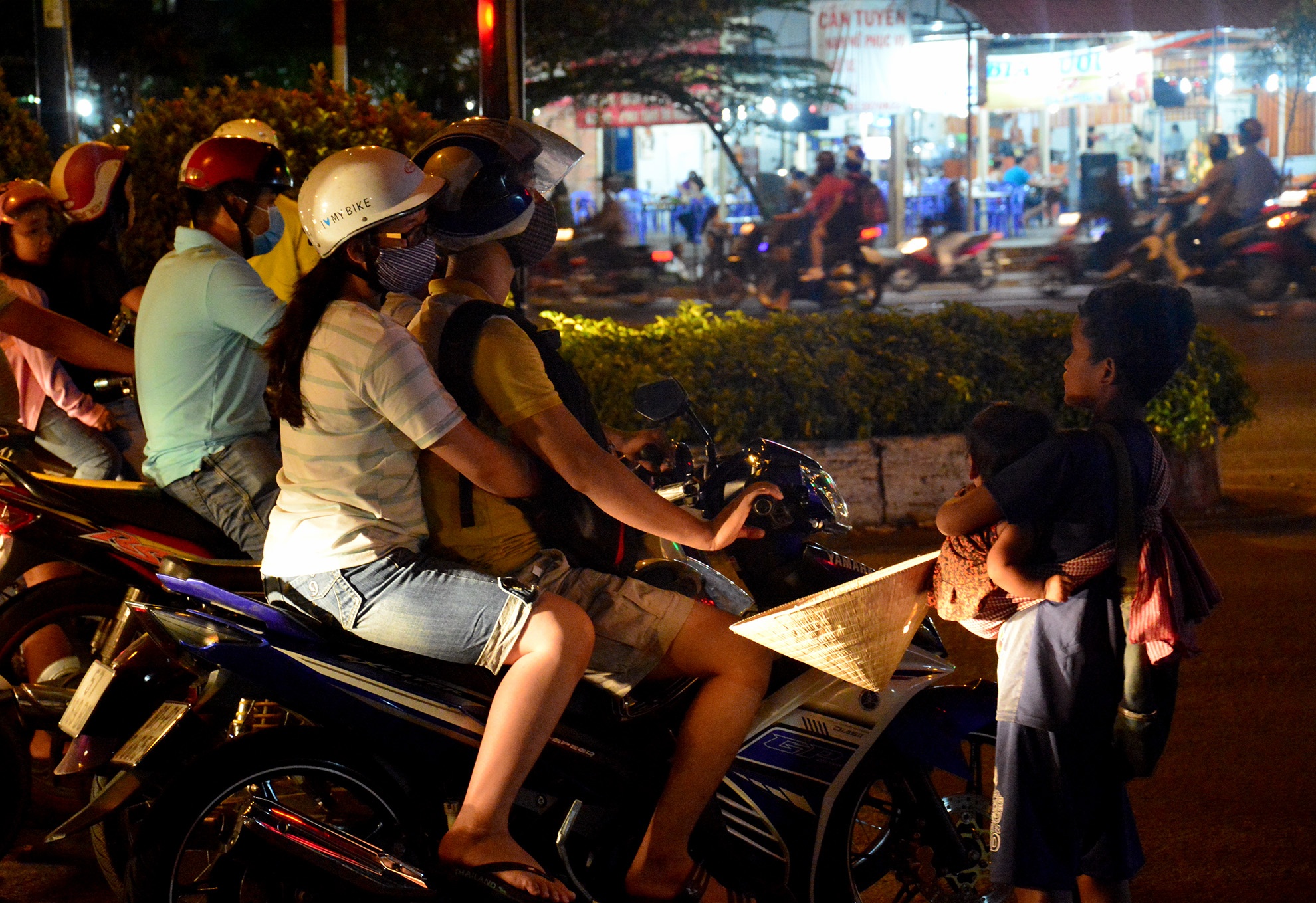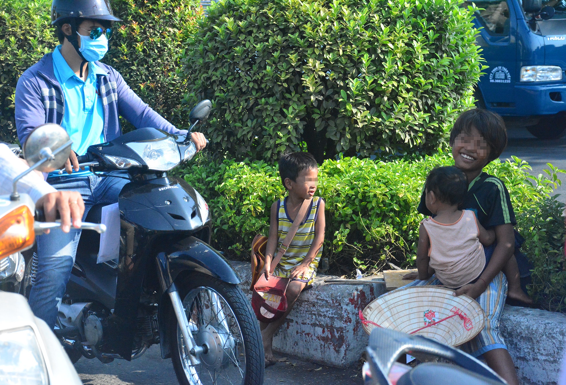 | Cậu bé lớn hơn bế theo đứa nhỏ chừng 1-2 tuổi, đội nắng len lỏi giữa dòng xe để xin sự bố thí của người đi đường. Những đứa trẻ từ vài tháng đến 2 tuổi đen nhẻm, ăn mặc rách nát là chiêu câu lòng thương người hiệu quả.