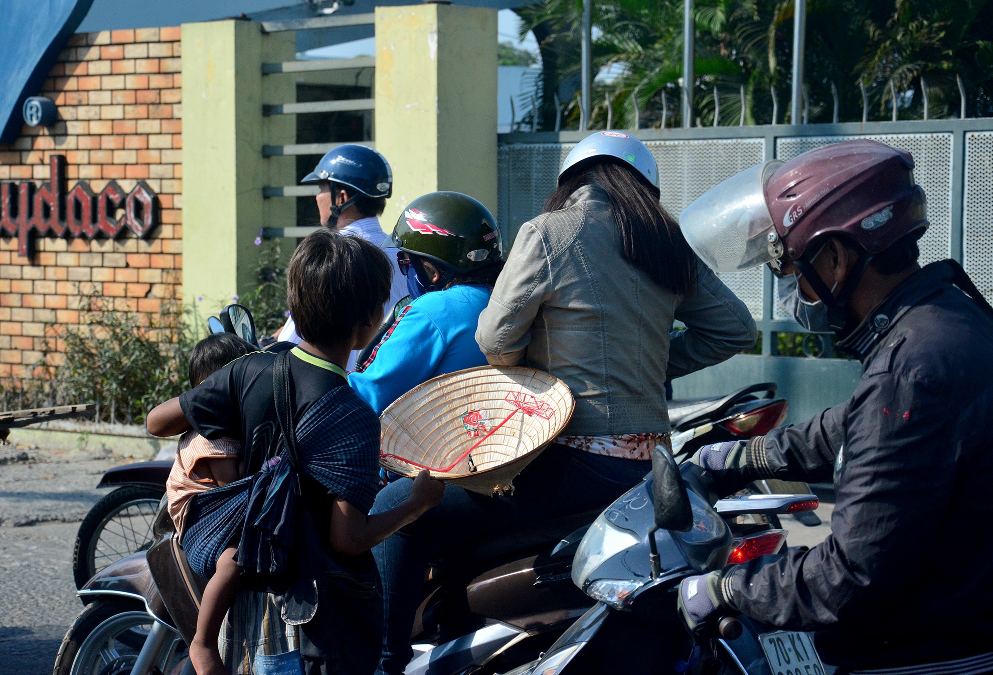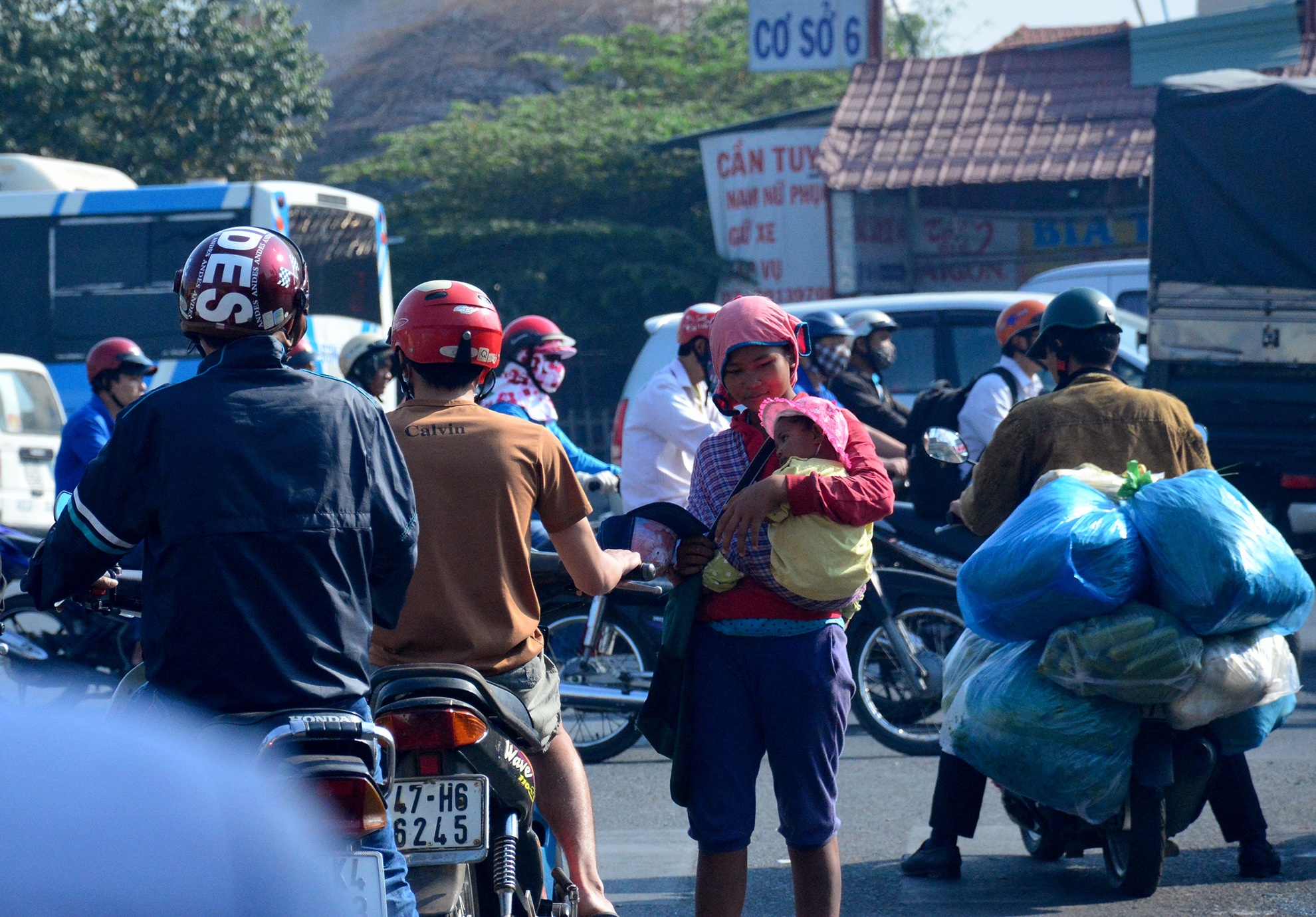 | Trước cổng Khu công nghiệp Tân Bình là một cô gái bế theo trẻ nhỏ. Khi phóng viên tiếp cận hỏi, một cậu bé bập bẹ tiếng Việt cho biết đều là người Campuchia. |
