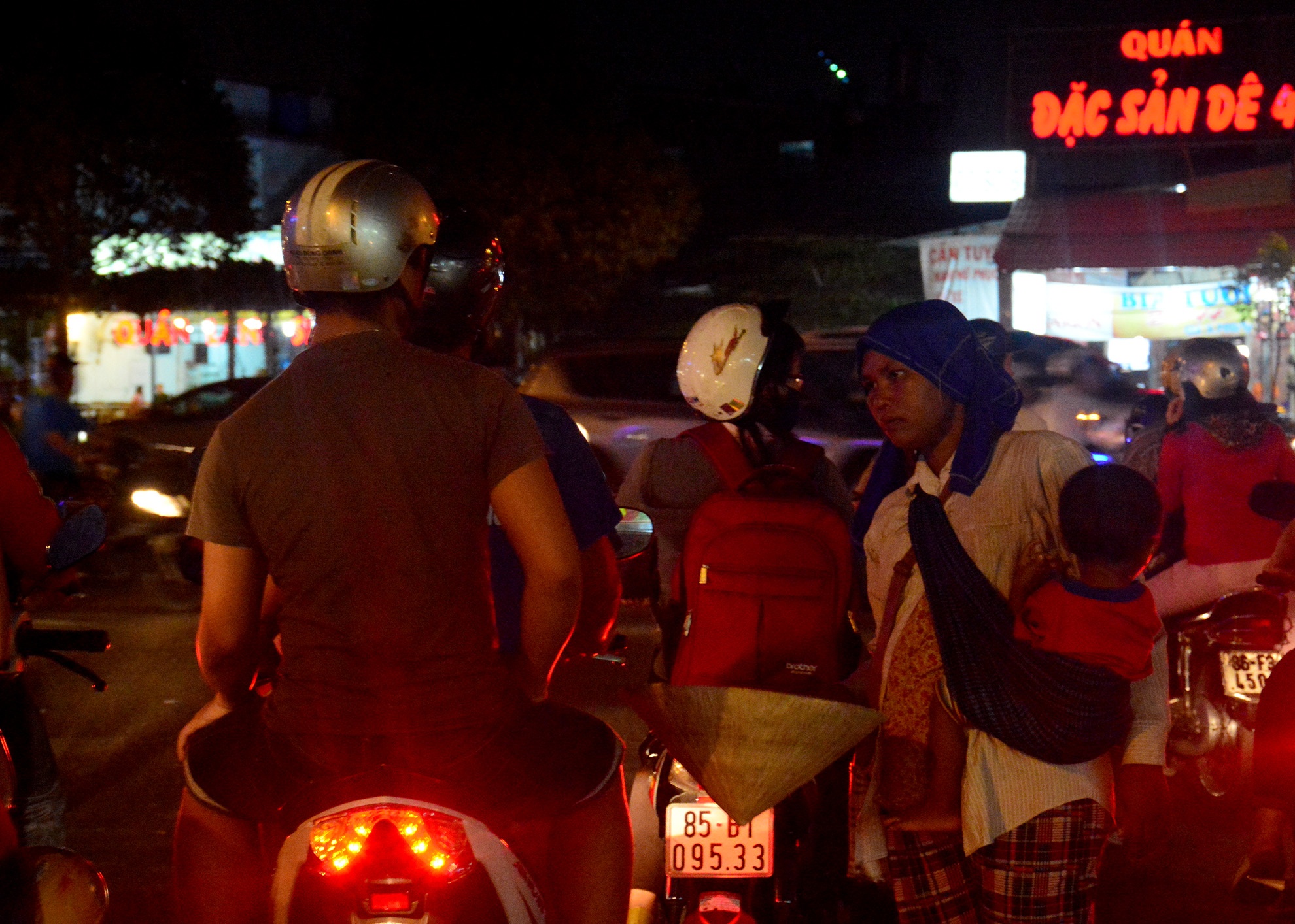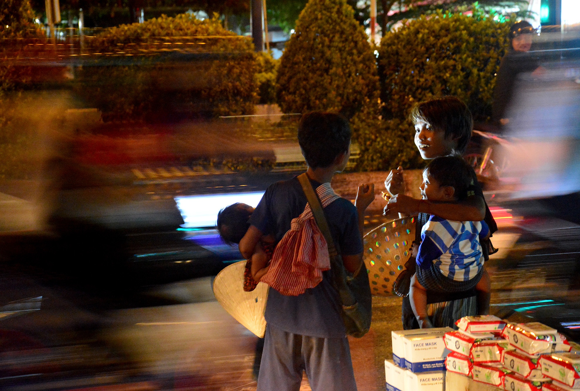 | Cũng tại khu vực này, buổi tối còn xuất hiện thêm một cậu bé bế theo đứa nhỏ cùng xin tiền người đi đường với 3 trẻ khác cho đến giữa đêm. |
