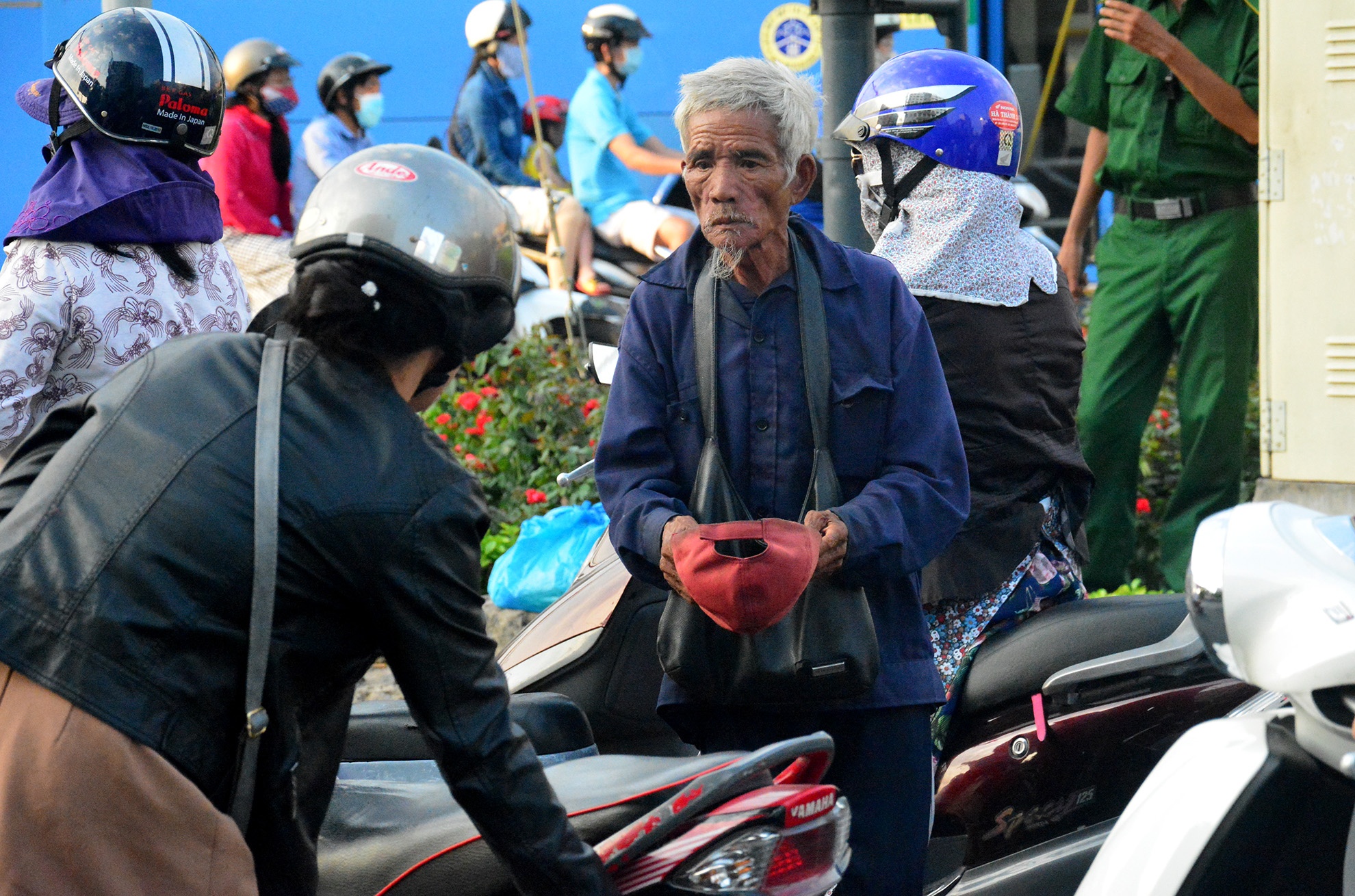 | Một cụ già mang theo túi tăm bông, hàng ngày ngồi bên đèn tín hiệu giao thông đầu đường Nguyễn Văn Trỗi, quận Tân Bình. Mỗi khi đèn đỏ sáng, ông lại lao ra giữa dòng xe để xin tiền người đi đường. |