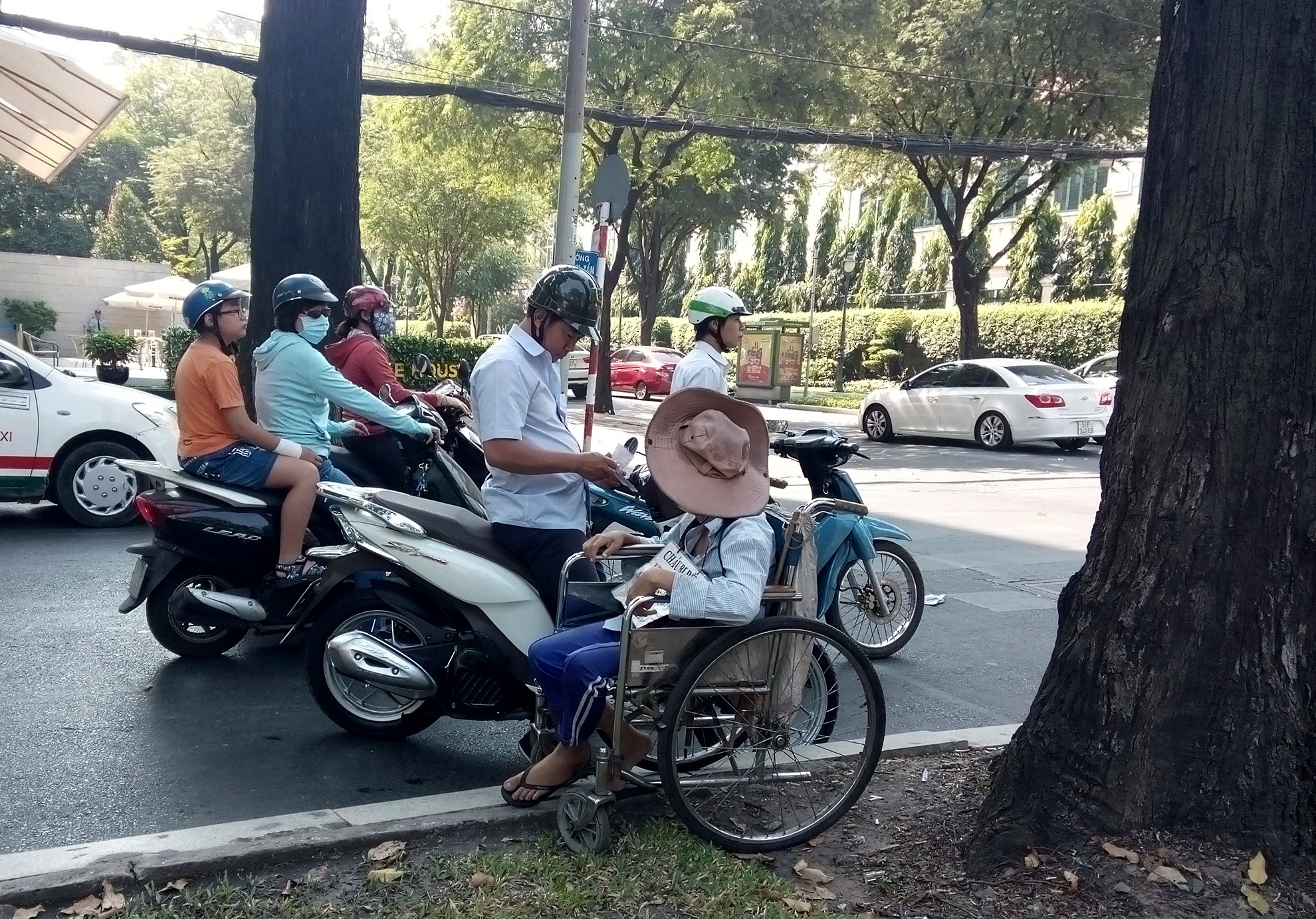 | Tại giao lộ Tân Kỳ - Tân Quý - QL1A (quận Bình Tân), một phụ nữ tàn tật được chở đến đây để ngồi xin tiền. |
