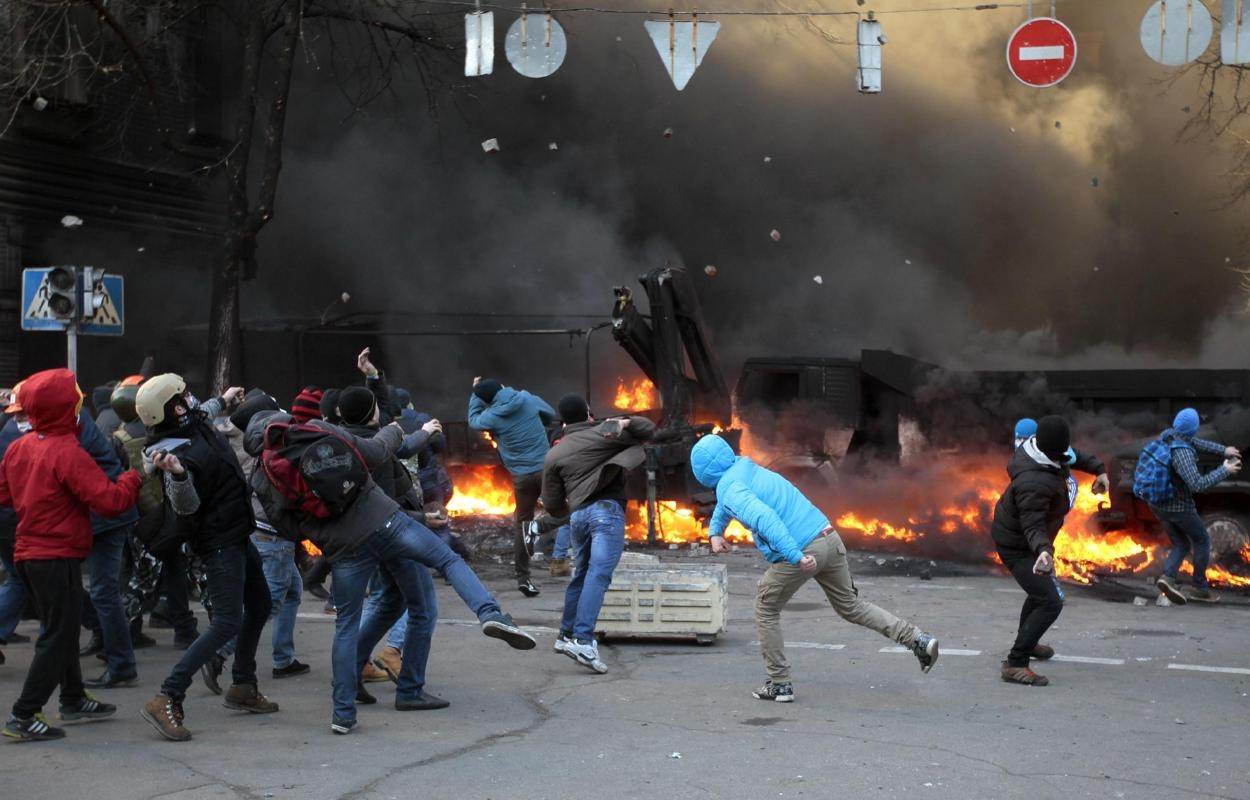 | Khói đen ngút trời trong cuộc đụng độ bên ngoài trụ sở quốc hội Ukraina hôm 18/2. Ảnh: AP |