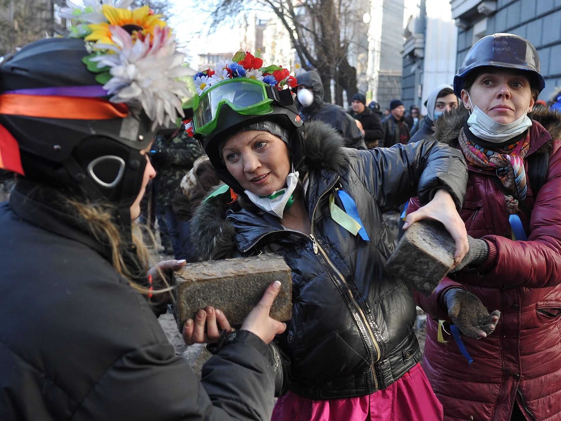 | Những người phụ nữ chuyển gạch cho những người đàn ông để họ ném cảnh sát. Vitali Klitschko, thủ lĩnh của phe đối lập, kêu gọi khoảng 20.000 người biểu tình bảo vệ các rào chắn xung quanh quảng trường Độc lập. Ảnh: EPA |