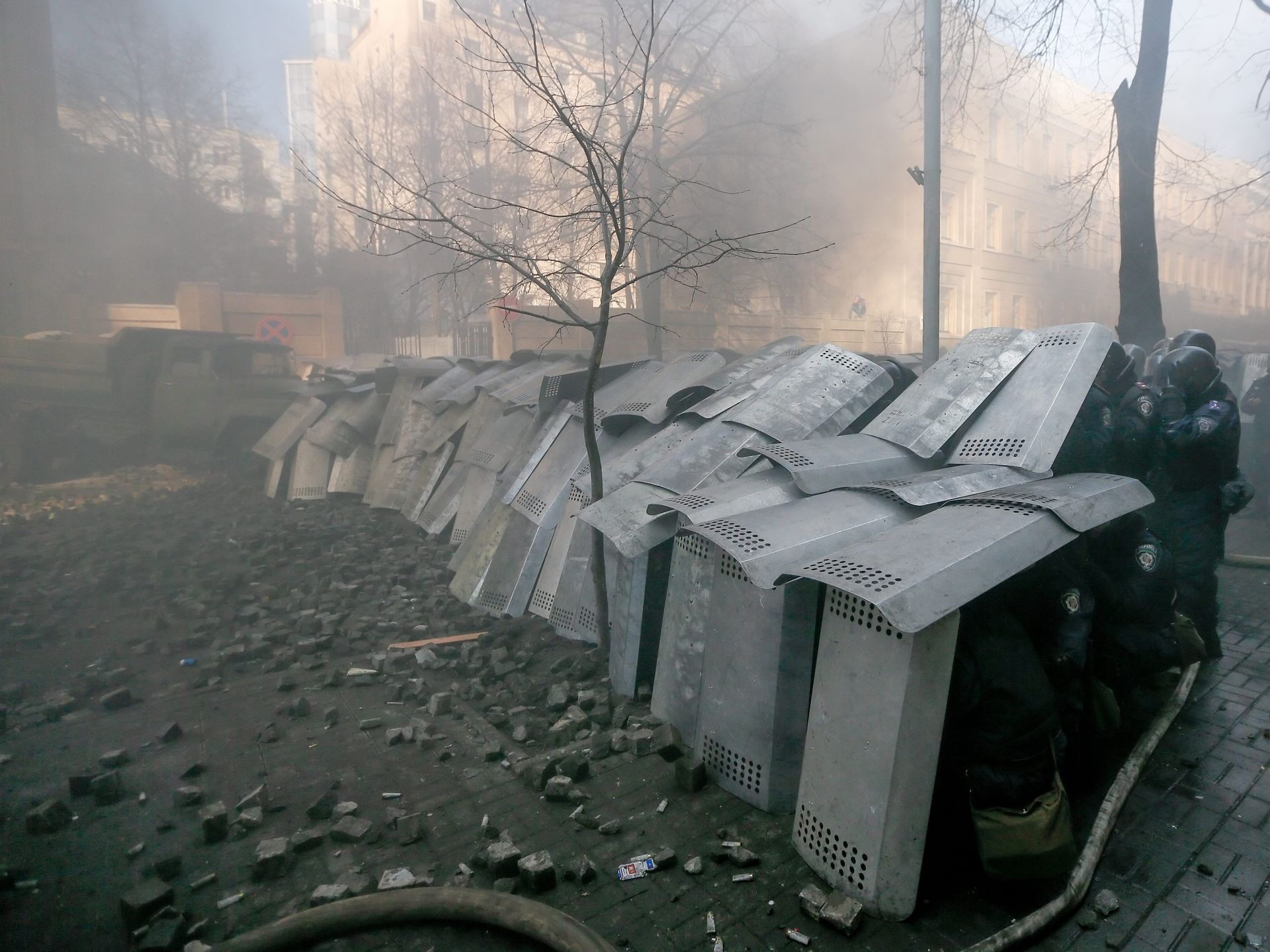 | Hàng nghìn cảnh sát chống bạo động dùng lựu đạn hơi cay, vòi rồng để trấn áp người biểu tình tại thành phố Kiev hôm 18/2. Ảnh: EPA |