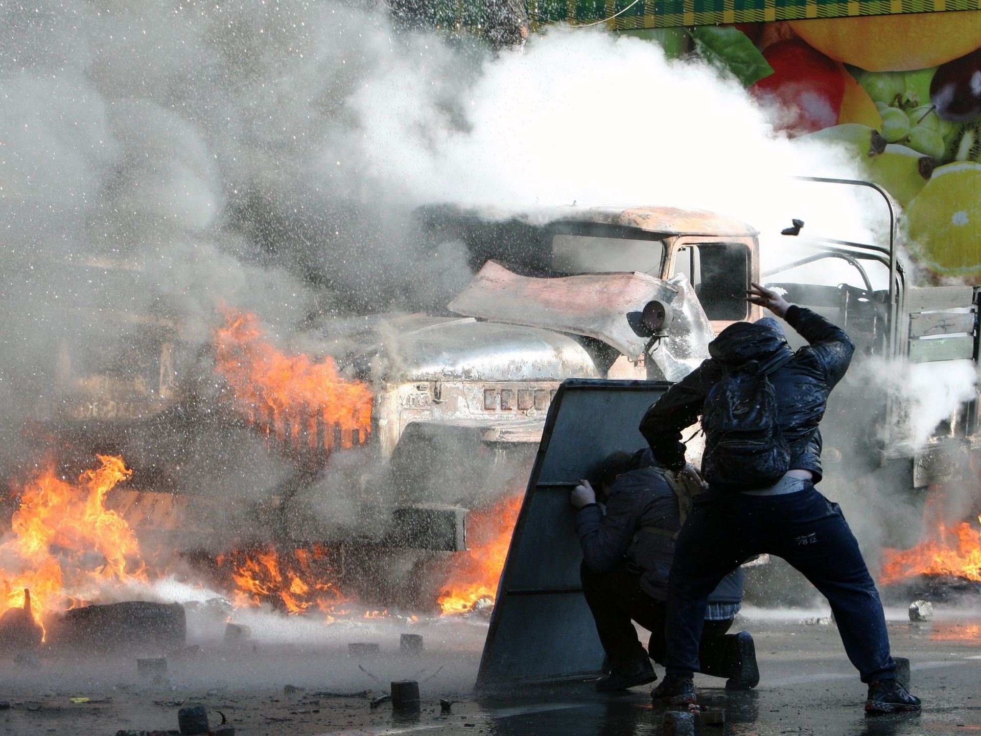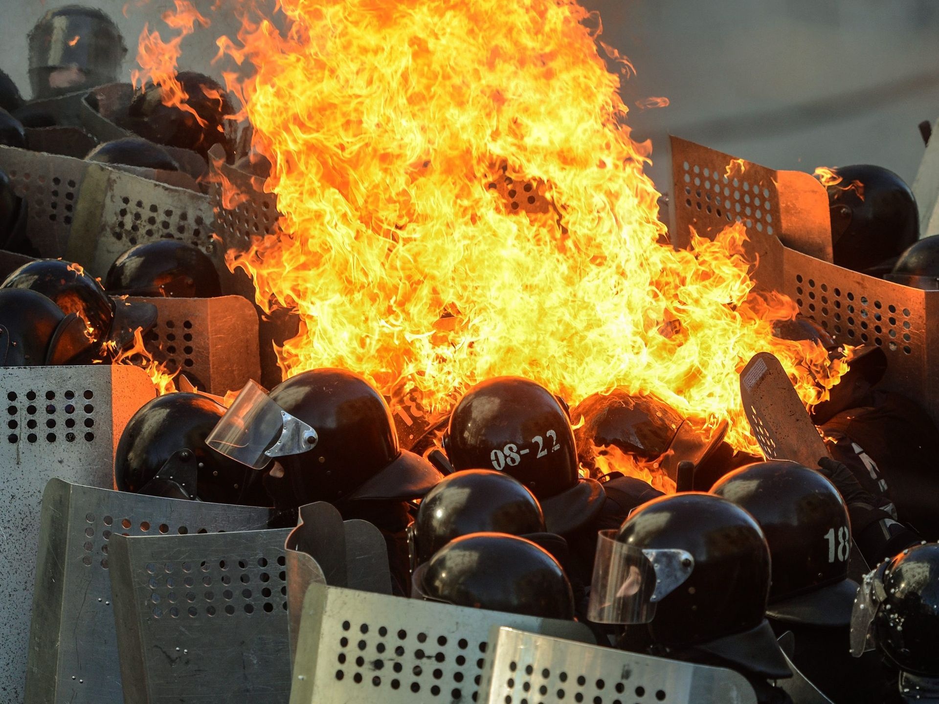 | Vài cảnh sát chống bạo động trở thành ngọn đuốc sống vì bom xăng của người biểu tình. Ảnh: EPA |