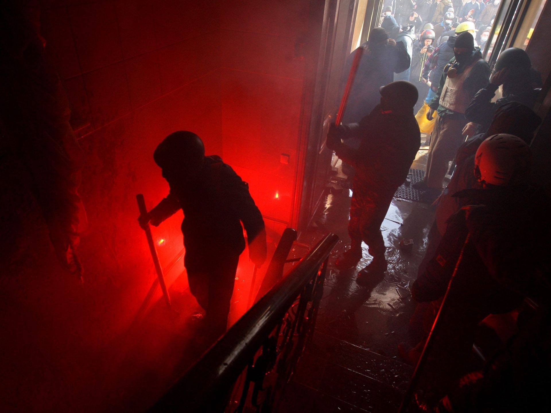 | Nhóm người chống chính phủ xông vào trụ sở của đảng Các vùng tại Kiev. Đảng Các vùng đang nắm quyền lãnh đạo Ukraina. Ảnh: EPA |