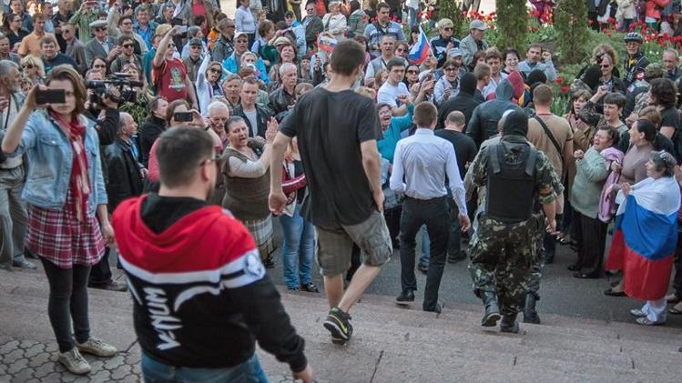 | Hàng trăm người tụ tập xung quanh Trung tâm Truyền hình Donetsk hôm 27/4. Khoảng một giờ sau khi người biểu tình chiếm Trung tâm Truyền hình Donetsk, các kênh của Ukraina vẫn hiện ra trên tivi. Nhưng giám đốc trung tâm xác nhận rằng người biểu tình đã yêu cầu ông đổi các chương trình để phát các kênh của Nga. Ảnh: EFE |