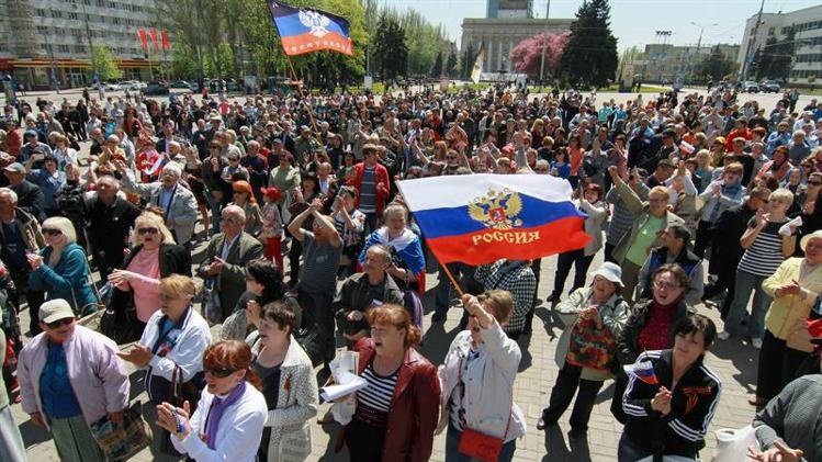 | Tại nhiều nơi khác trong thành phố Donetsk, những người ủng hộ Nga tiếp tục biểu tình. Ảnh: EFE |