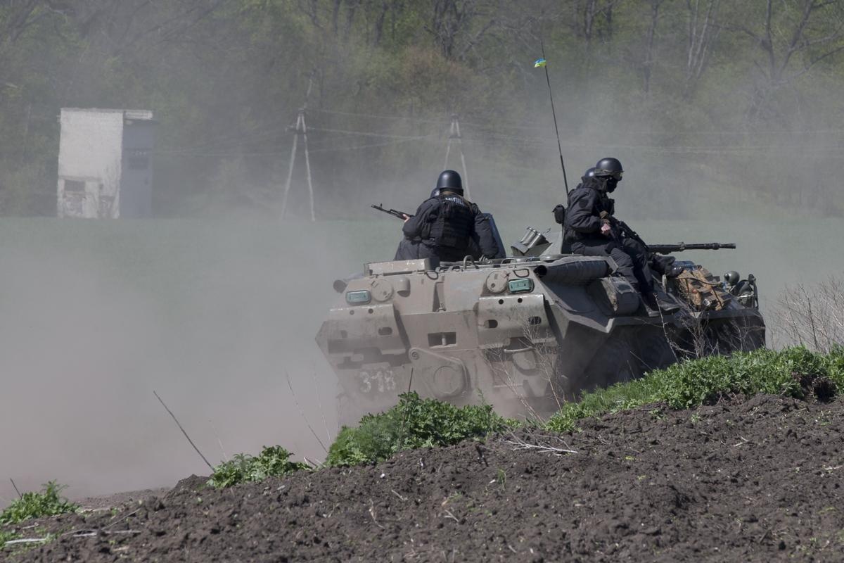 | Binh sĩ Ukraina hành quân bằng xe bọc thép gần thành phố Svyitohirsk ở phía đông Ukraina hôm 26/4. Họ tham gia chiến dịch trấn áp lực lượng ly khai do chính phủ Ukraina phát động. Ảnh: AP |