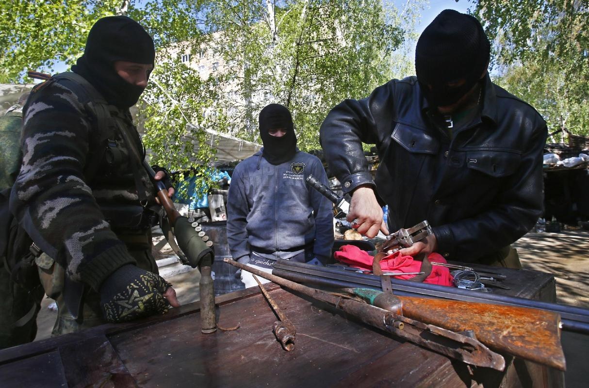 | Một nhóm người ly khai sửa súng tiểu liên cũ để tái sử dụng ở thành phố Slaviansk. Ngoại trưởng Nga Sergei Lavrov tố cáo phương Tây âm mưu kiểm soát Ukraina. Ảnh: AP |