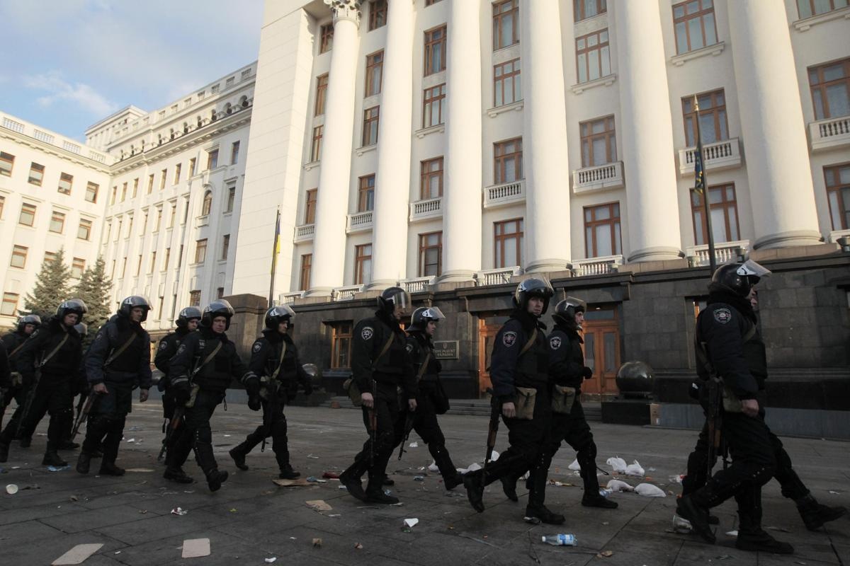 | Nhóm cảnh sát chống bạo động rời dinh tổng thống Ukraina hôm 21/2, sau khi ông Yanukovych ký thỏa thuận chấm dứt khủng hoảng với phe đối lập. Ảnh: AP |