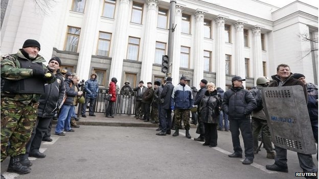 | Người biểu tình canh gác tòa nhà quốc hội Ukraina hôm 21/2. Ảnh: Reuters |