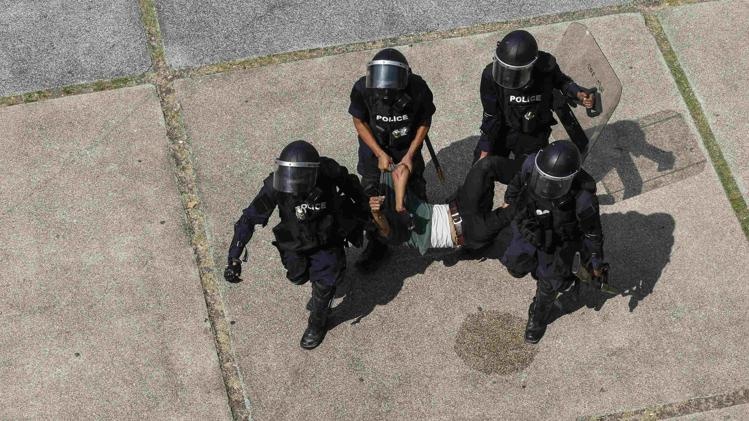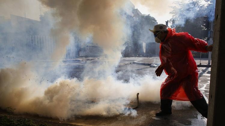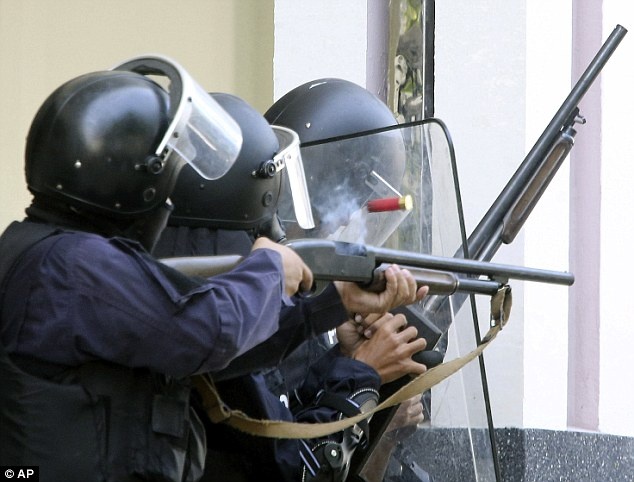 | Cảnh sát bắn đạn cao su để ngăn cản những người biểu tình khi họ xông vào một sân vận động phản đối các ứng cử viên đăng ký tên với Ủy ban Bầu cử Quốc gia trong một sân vận động ở trung tâm thành phố. Ảnh: AP |