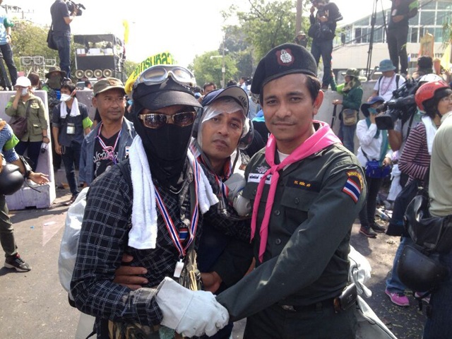 | Cảnh sát bắt tay và ôm người biểu tình sau khi đám đông tràn vào trụ sở cảnh sát đô thành Bangkok hôm 3/12. Ảnh: Bangkok Post. |
