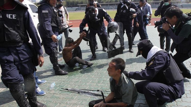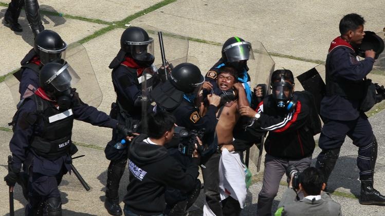 | Một phóng viên chụp cảnh tượng cảnh sát bắt những người biểu tình quá khích trong sân vận động. Ảnh: Reuters |