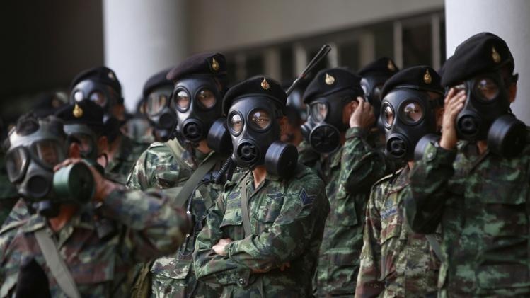 | Binh sĩ đeo mặt nạ phòng độc khi canh gác tại sân vận động. Họ không mang vũ khí. Ảnh: Reuters |