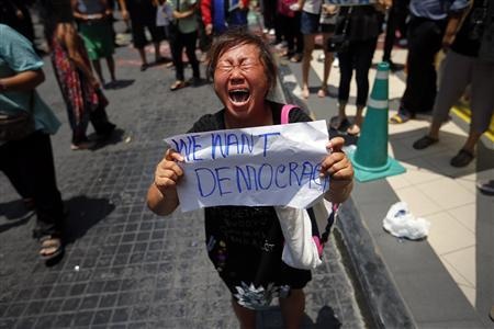 | Người phụ nữ khóc khi giờ tờ giấy với dòng chữ: "Chúng tôi muốn dân chủ" khi biểu tình tại Bangkok hôm 25/5. Ảnh: Reuters |