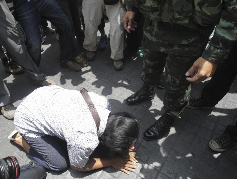 | Một phụ nữ quỳ xuống để van xin binh sĩ không ngăn chặn người biểu tình tại thành phố Bangkok hôm 25/5. Ảnh: AP |
