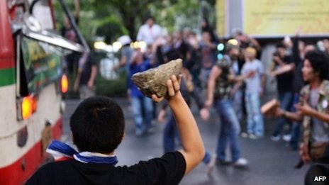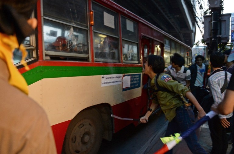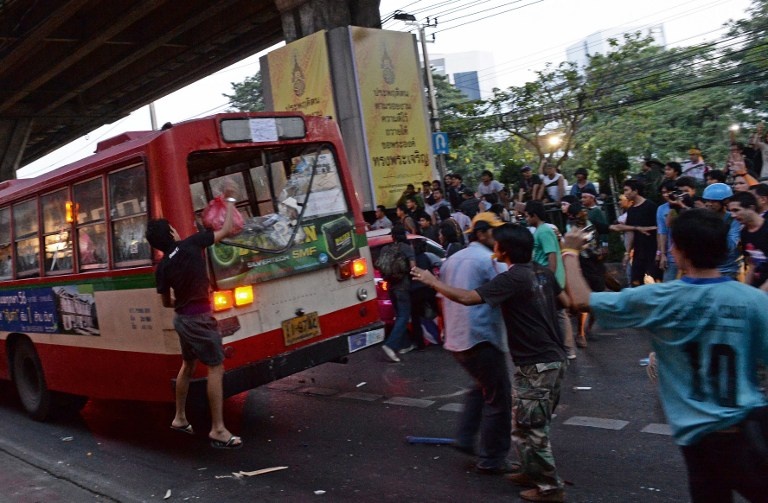 | Nhiều thanh niên cầm hòn đá để ném vào chiếc xe bus chở người ủng hộ chính phủ tại Bangkok hôm 30/11. Ảnh: AFP. |