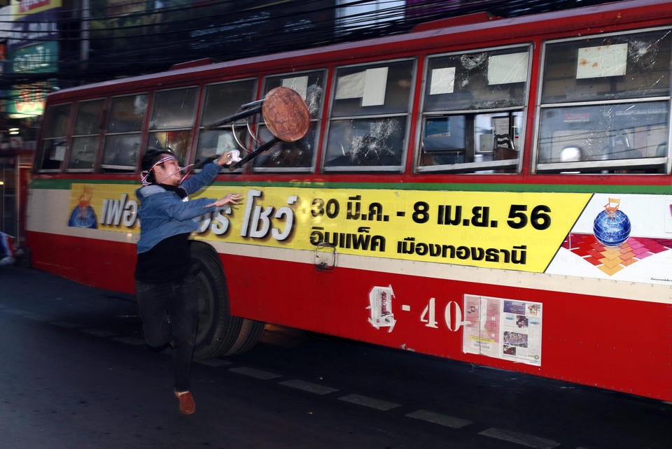 | Một thanh niên dùng ghế để đập vào kính xe bus chở người thuộc phe áo đỏ hôm 30/11. Ảnh Reuters. |