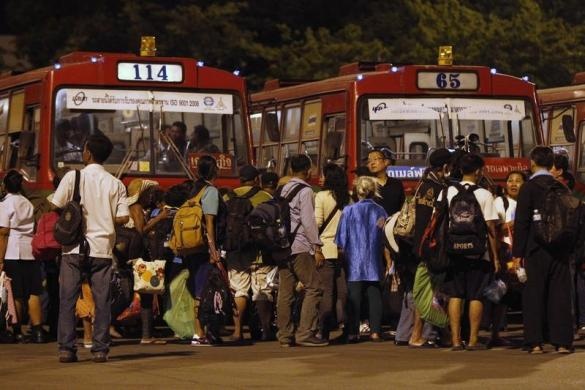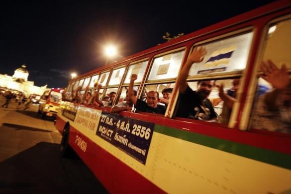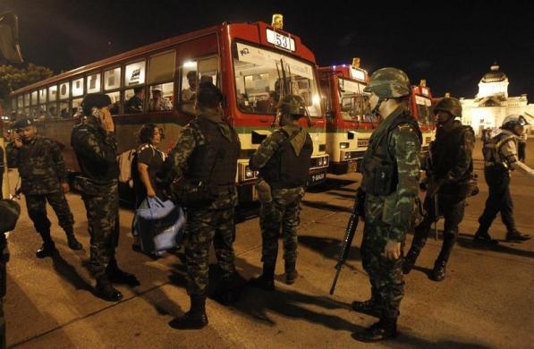 Lực lượng biểu tình chống chính phủ đón xe bus trở về nhà tại Royal Plaza, Bangkok ngày 22/5. Ngay sau khi tổng tư lệnh quân đội tuyên bố đảo chính, đồng lãnh đạo lực lượng biểu tình chống chính phủ PDRC Phra Buddha Issara đã đăng đàn công bố chiến thắng và kêu gọi đám đông về nhà. Ảnh: Reuters.