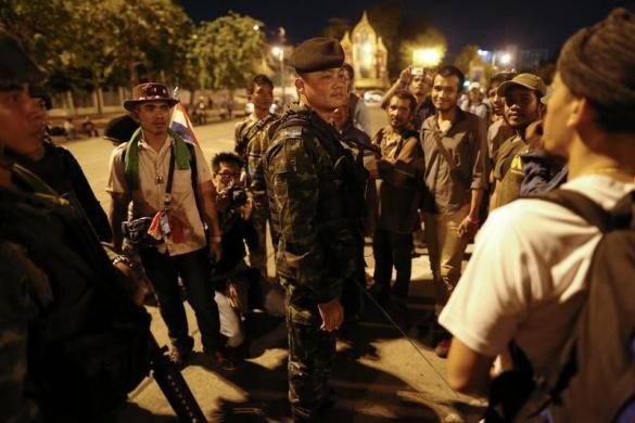Khung cảnh tại thủ đô Bangkok của Thái Lan sau khi quân đội tuyên bố đảo chính. Hàng trăm binh sĩ và cảnh sát được triệu tập tại các căn cứ quân đội và địa điểm tập trung của người biểu tình các bên, trong hoạt động thắt chặt an ninh sau tuyên bố đảo chính. Ảnh: Reuters.
