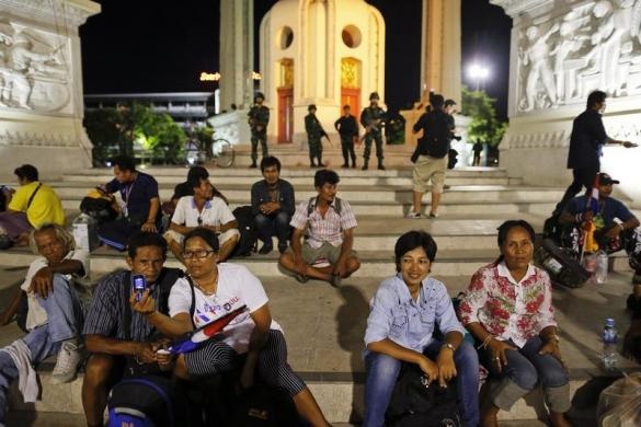 Lực lượng chống chính phủ đợi xe tại Tượng đài Dân chủ ở Bangkok tối 22/5. Trước tình hình chính trị của đất nước, phe Áo đỏ - những người ủng hộ cựu thủ tướng Thaksin và Yingluck Shinawatra - tỏ ra thất vọng và tức giận vì hành động của quân đội nhưng khẳng định họ không tổ chức biểu tình ngay lập tức. Ảnh: Reuters.