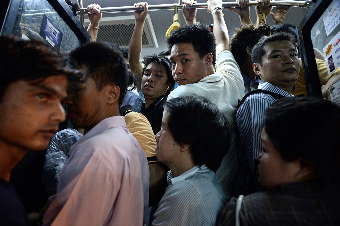 Xe bus chở người biểu tình tại Bangkok chật cứng. Mỹ tuyên bố cân nhắc lại quan hệ quân sự với Thái Lan sau khi quân đội của nước đồng minh thân tín này thực hiện cuộc đảo chính không đổ máu. Ảnh: AFP.